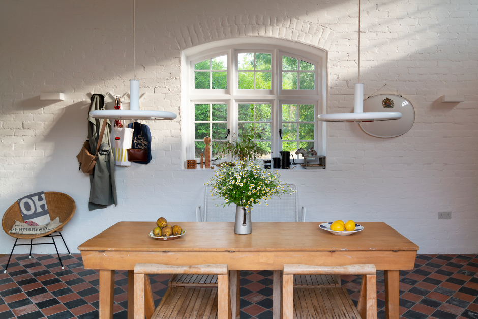 Dining table in the double height living space of a new home, repurposed and extended from an estate engine room.
